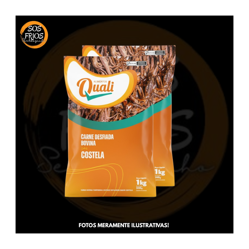 Carne bovina desfiada sabor costela, da marca Quali (fabricada por Bieda Alimentos Ltda), embalada a vácuo e congelada, pronta para uso em lanches, porções, pizzas ou pratos rápidos.