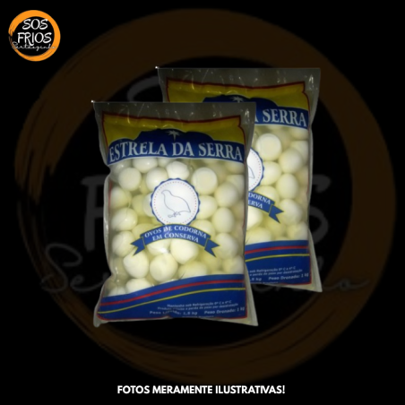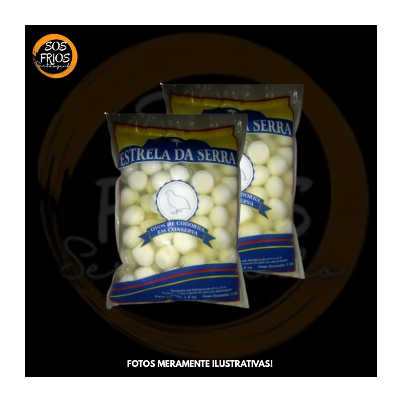 Pacote de 1 kg de ovos de codorna em conserva, da marca Estrela da Serra, ideal para consumo em refeições, petiscos ou como ingrediente em saladas e preparações práticas.