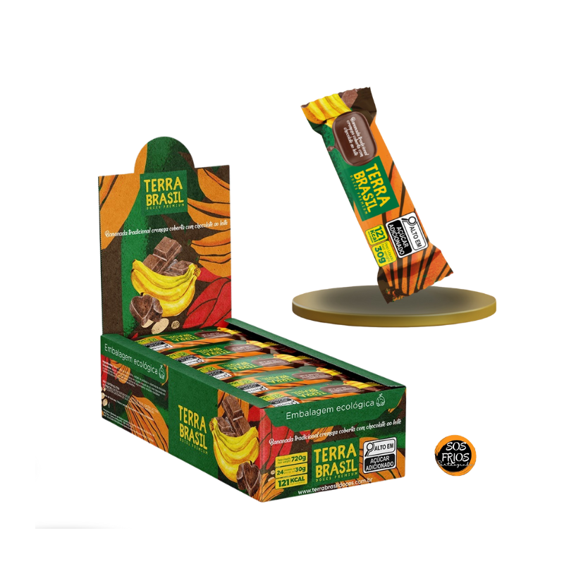 A bananinha tradicional cremosa coberta com chocolate ao leite da Terra Brasil Doces Premium é a escolha perfeita para quem procura um doce delicioso. Cada mordida é uma explosão de doçura e cremosidade, unindo a riqueza do chocolate ao leite com a deliciosa textura da bananada.
