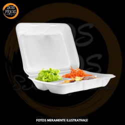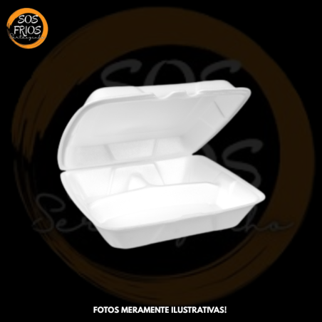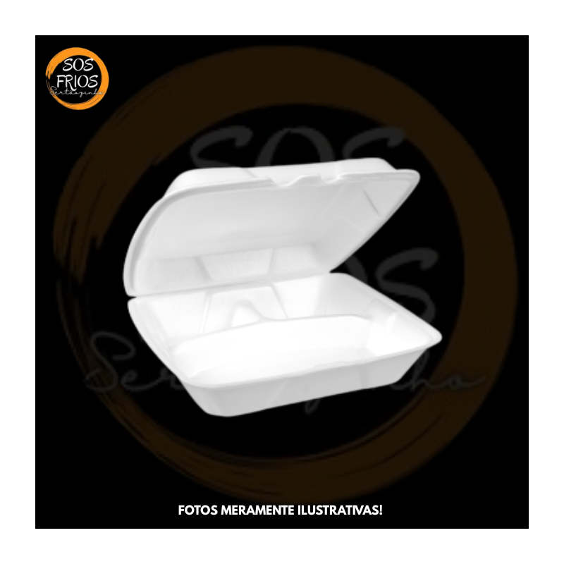 Hamburgueira de isopor com 3 divisórias — ideal para delivery ou lanches completos.
