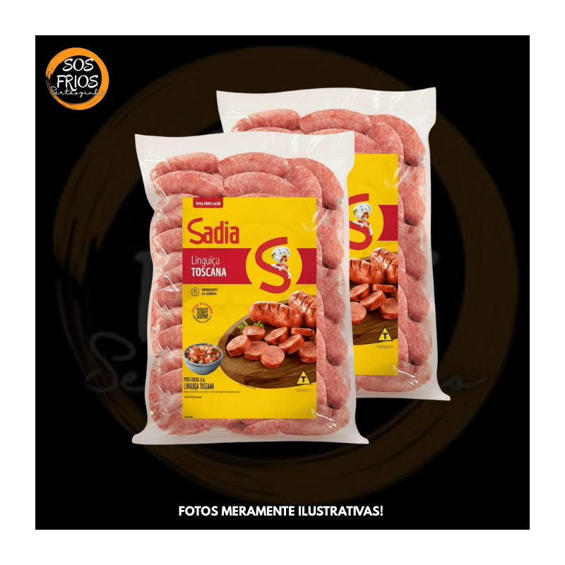 Linguiça tipo toscana da marca Sadia, feita com carne suína temperada com alho, ervas e especiarias, ideal para grelhar ou assar. Disponível em embalagem por quilo ou em pacotes maiores (ex: 5 kg) para consumo comercial.
