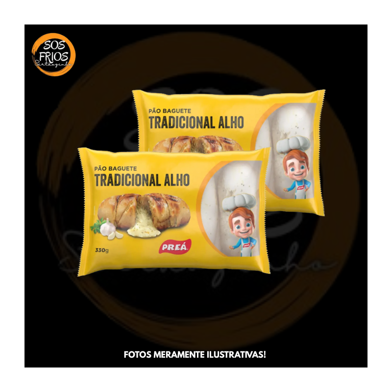 — baguete sabor alho da marca Preá, em embalagem de 330 g, ideal para assar ou aquecer como aperitivo ou acompanhamento de carnes e refeições.