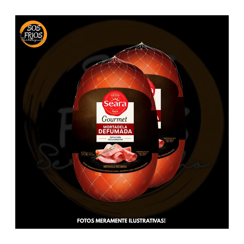 Molho de Tomate… desculpe, mortadela defumada da linha Gourmet da Seara, elaborada com matérias‑primas selecionadas, especiarias e pimenta branca, submetida ao processo de defumação e cozimento no vapor para garantir textura macia e sabor refinado.