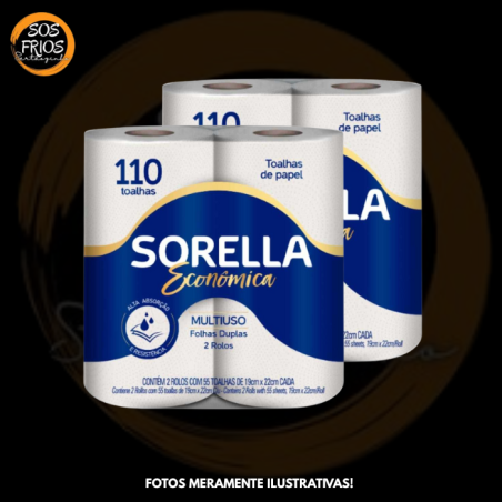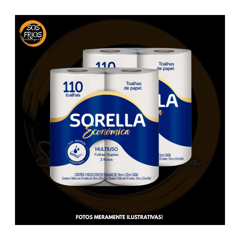Pacote com 2 rolos da marca Papel Toalha Sorella 2 Rolos, cada rolo geralmente com cerca de 55 folhas (total ~110 folhas por embalagem) na versão “Absolute” ou 55 folhas x 2 para a versão econômica. Indicado para uso doméstico ou leve uso comercial.