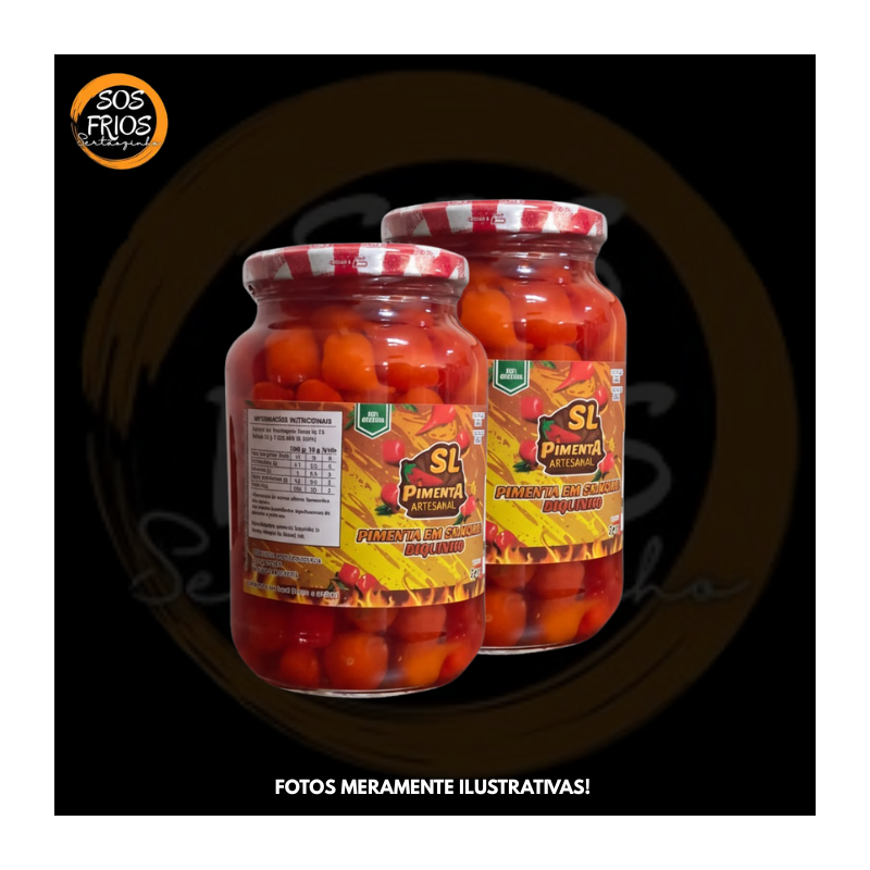 Conserva de pimenta biquinho da marca Pimenta Artesanal SL, em embalagem de 500 g. Caracteriza-se por ter textura macia, sabor levemente adocicado e ausência de ardência, servida em salmoura (água, vinagre, sal).