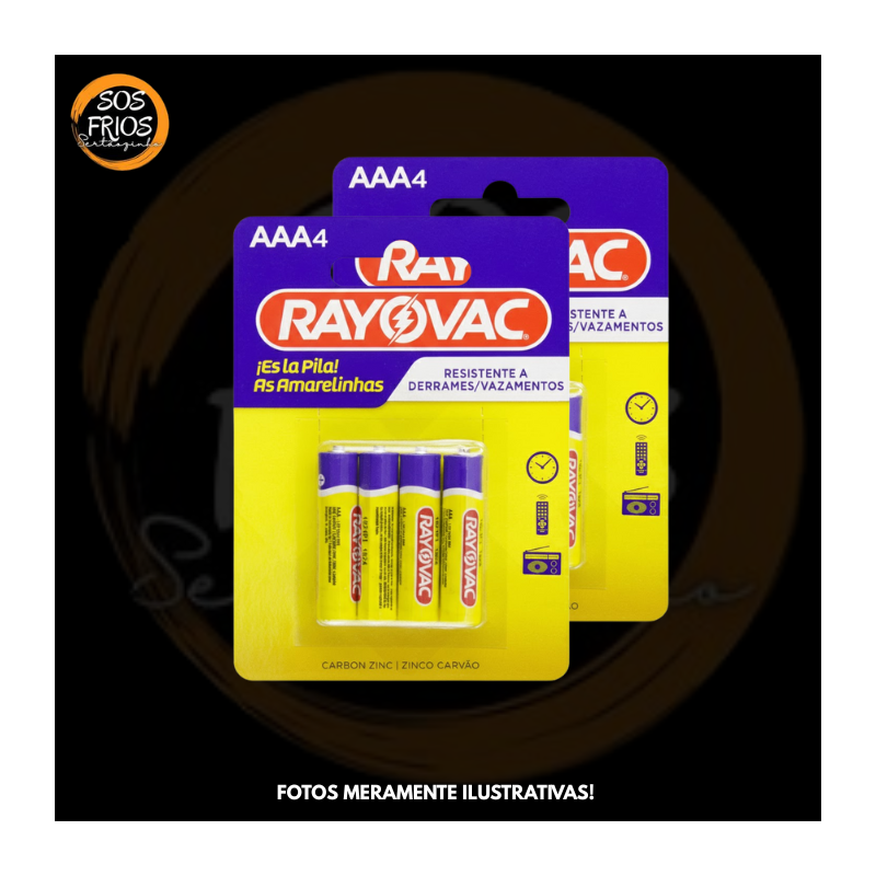 Cartela com 4 pilhas tamanho AAA (1,5 V) da marca Rayovac, voltadas para uso em dispositivos domésticos de médio a baixo consumo, tais como controles remotos, relógios, brinquedos pequenos ou qualquer aparelho que utilize o formato “palito” AAA.